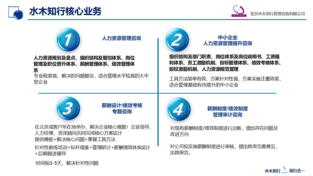 北京水木知行管理咨詢有限公司(www.bjsmzx_com.529959.com)專注提供人力資源管理咨詢、人力資源管理培訓(xùn)、人力資源招聘咨詢、人力資源獵頭服務(wù)業(yè)務(wù);咨詢業(yè)務(wù)范圍包括組織結(jié)構(gòu)與管控體系、崗位管理體系、薪酬管理體系、績效管理體系,咨詢形式包括全過程咨詢、教練式咨詢和特訓(xùn)班;培訓(xùn)業(yè)務(wù)包括企業(yè)基礎(chǔ)管理...[詳情]